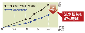 レギュラーサイズゴーグルに比べ、流水抵抗を47%軽減