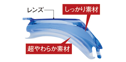 レンズを覆うフレーム部に「しっかりタイプ」のシリコーン素材を使用してフェイスパッドがズレにくく、肌に触れる部分には、顔に合わせて柔軟に変形する「超やわらかタイプ」のシリコーン素材を使用して、やさしい肌あたりとフィット感を実現しました。