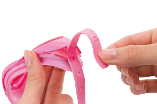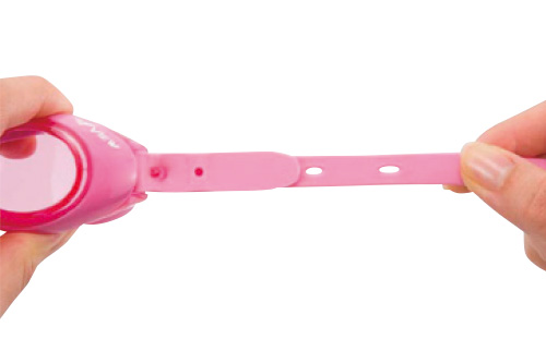小さな力で伸びる素材を用いた、お子様でも着用しやすいストラップ。さらに、部分ごとに厚さと幅を変え、圧迫感のないやさしい装着感も実現しました。