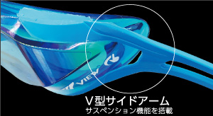抵抗を低減させるサイドアームがさらに進化しました。レンズの中心近くに取り付けられたV型サイドアームが「ズレない」「ブレない」を追求。顔の動きやストローク時の腕の接触による負荷をサイドアームが吸収し、レンズがしっかり顔にフィットし続けます。
